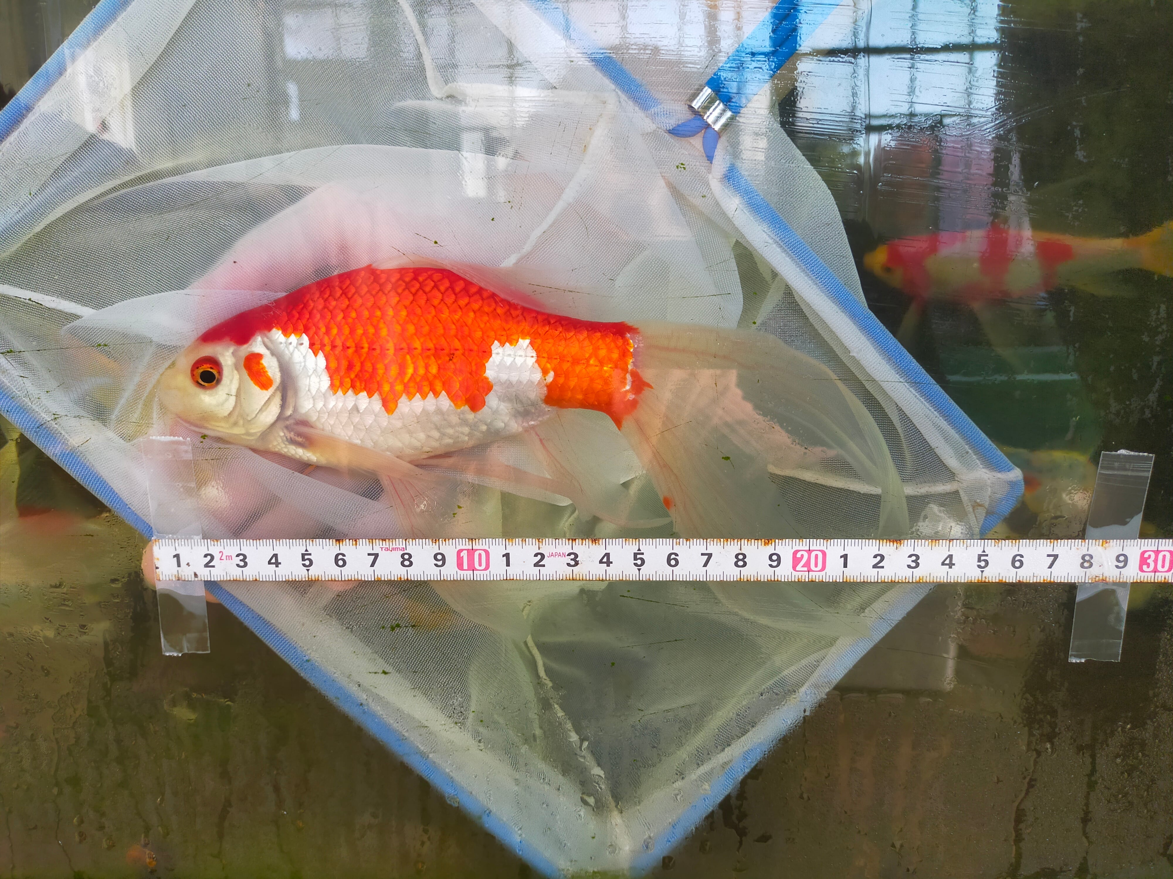 流線形の体型と、長く優雅に伸びる透明感のある尾びれが特徴的な大型金魚です。